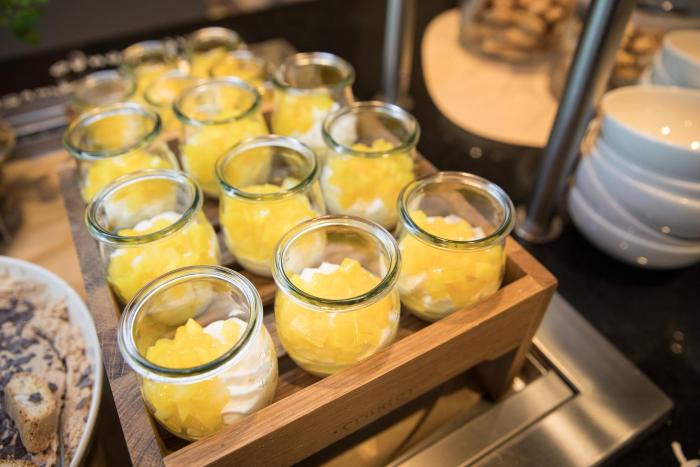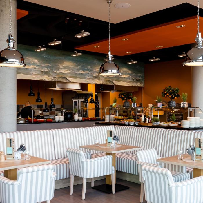 The dining area includes a restaurant and a bar. Half board can be booked. Breakfast and dinner offer culinary delights every day. Special meals, including vegetarian dishes, are also available. The hotel also offers snacks.