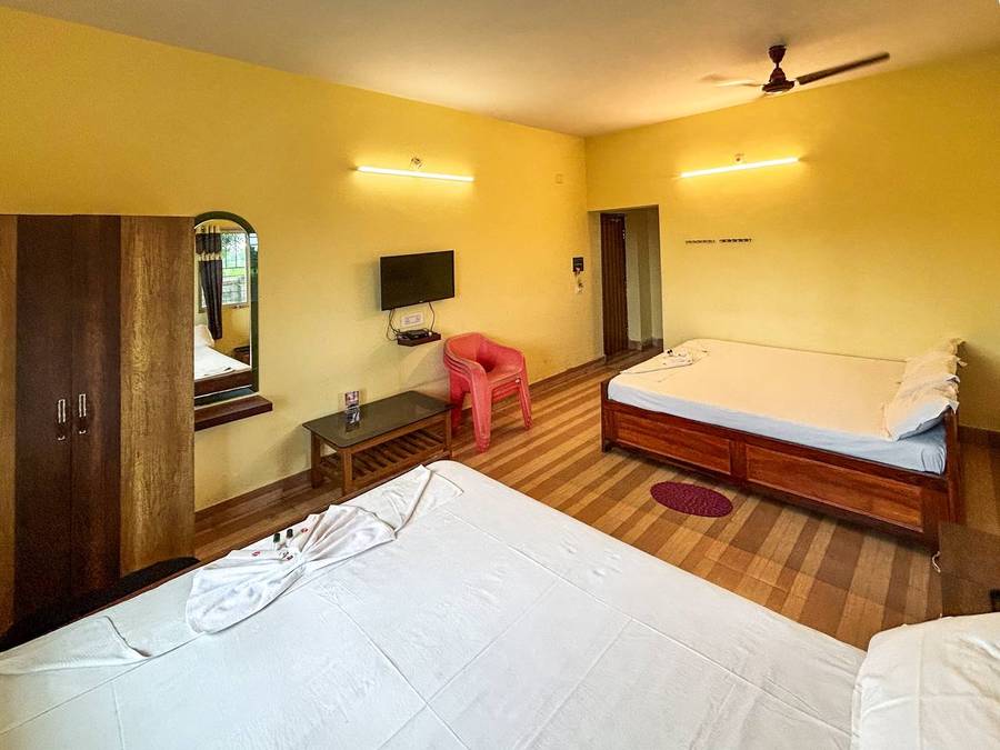 • Ground Floor: Swiss Cottage Tents, Deluxe Double Bed Rooms, Super Deluxe Triple Bed Rooms, and Family Four Bed Rooms.
