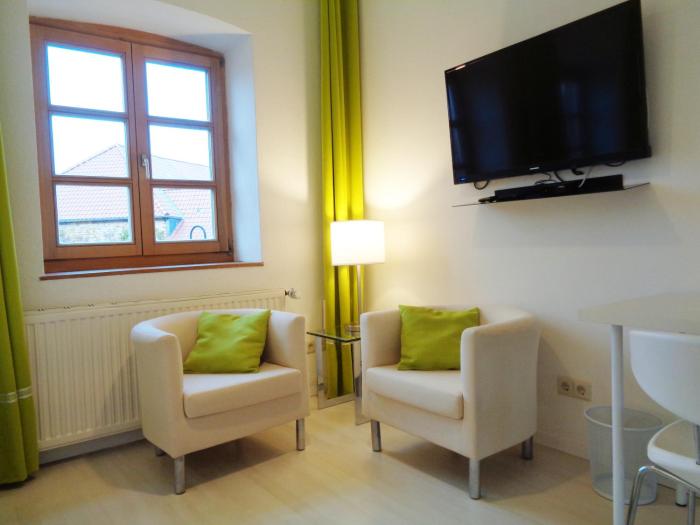 Rooms have a double bed or a sofa bed. Guests can also reserve separate bedrooms. In the rooms guests will find a refrigerator, a television with satellite channels and a DVD player. Slippers are included. A hairdryer and bathrobes are available in the bathrooms, which are equipped with a shower.