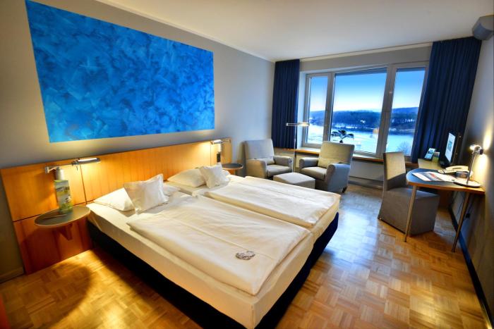 Very comfy hotel with great spa and long swimmingpool. Spacious room. Good breakfast. A bit difficult to reach from the highway, but worth a visit. Big lake nearby - I did not have the weather to...