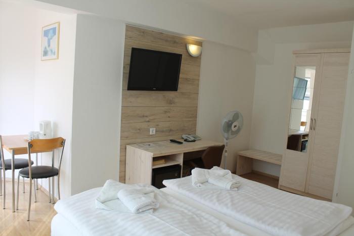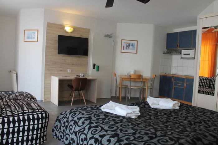 The rooms of the hotel include central heating and a fan. A fully-equipped kitchenette with a refrigerator, cooktop, microwave and tea/coffee station, as well as a complete set of utensils, is a standard feature. A telephone, a television with cable channels, a radio and WiFi (for a fee) are provided as well. Bathrooms are equipped with a shower and a bathtub, as well as a hairdryer.