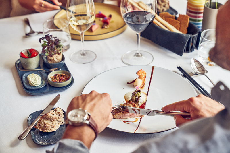 The dining area includes a restaurant and a café. Half board can be booked. Breakfast and dinner offer culinary delights every day. Gluten-free meals and vegetarian dishes can be prepared on request. The hotel also offers snacks. The show cooking is a particularly special attraction.