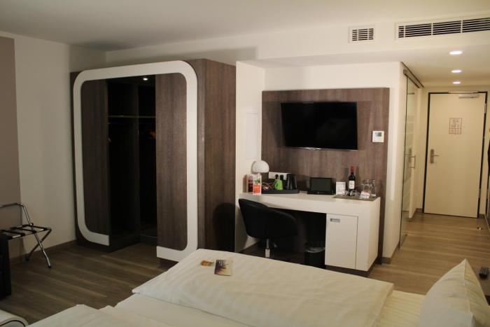 Parking (14EU) was directly under the hotel. Staff was very friendly. The room (#202 in rear building) was quite large and very pleasant with separate sitting area, albeit a bit pricier than some...