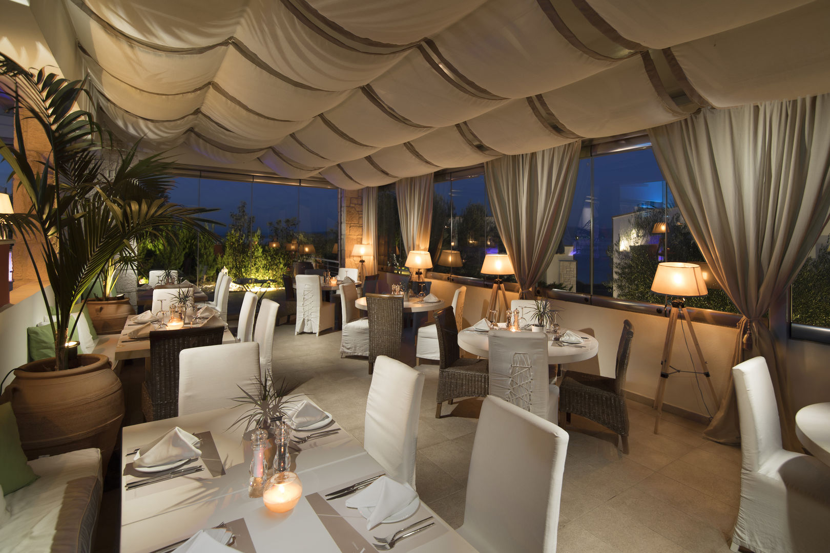 The dining area includes a restaurant and a bar. Half board can be booked. Breakfast and a set dinner menu are served every day.