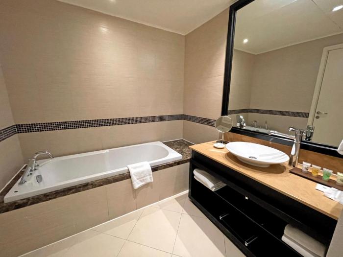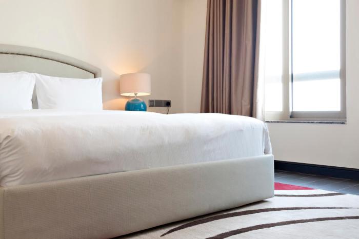 Air conditioning ensures that rooms maintain comfortable temperatures. A balcony is included as a standard feature in some rooms. All rooms are carpeted and include a double bed or a king-size bed. Children's beds and extra beds can be requested for younger guests. A safe, a minibar and a desk are also available. Additional features include a refrigerator, a mini fridge and a tea/coffee station. An ironing set is provided for guests' convenience. A direct dial telephone, a television with satellite/cable channels, a radio and WiFi are provided as well. Amenities provided in the rooms include slippers and a daily paper. Bathrooms are equipped with a shower and a bathtub. A hairdryer, a vanity mirror and bathrobes are available for daily use. The hotel has family rooms, 118 non-smoking rooms and 1 smoking room.
