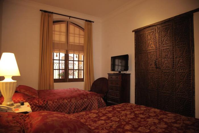 This hotel is very well situated just behind the main square. Its public rooms are lovely and courtyards delightful. Our room had French Door style doors with glass panels which were covered with...