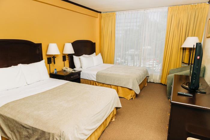 We reserved 2 suits for one night. You do your check in at the Crown Plaza Hotel which is connected to Plaza Hotel and Suits. You are able to use all the facilities at the Crown Plaza Hotel. It is a...