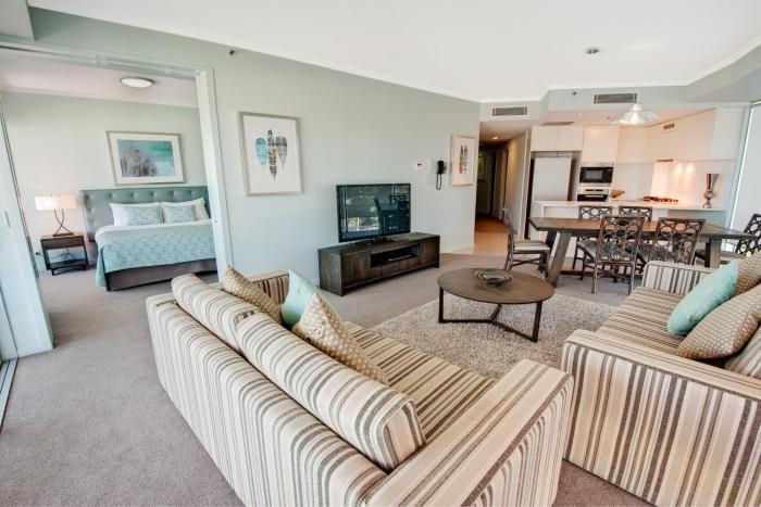 We had a corner front apartment , so nice view to beach and around side of building. Apt was clean and comfy, spacious with two rooms and another smaller lounge with fold out bed. Spa and pool area...