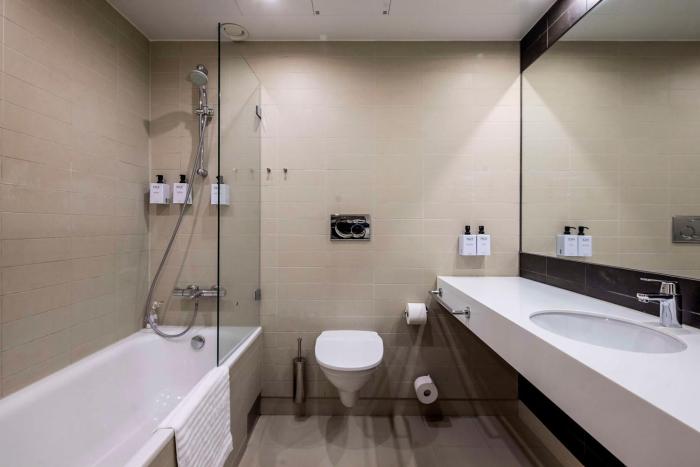 A safe and a desk are also available. Extra comforts include a tea/coffee station. An ironing set is provided for guests' convenience. A TV and WiFi (no extra charge) are provided as well. A hairdryer is provided in the bathrooms. For extra comfort in the bathrooms, guests are offered cosmetic products. 25 wheelchair-friendly rooms can be reserved. Family rooms are available for parents with children.