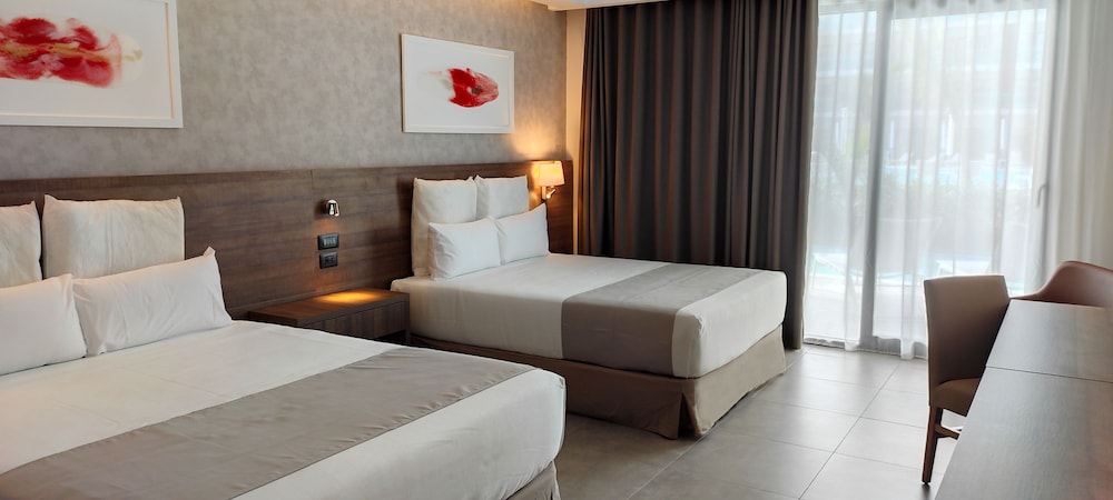 Air conditioning and a fan ensure that rooms maintain comfortable temperatures. Guests can enjoy the sea view from a balcony or terrace. Rooms have a queen-size bed, a king-size bed or a sofa bed. Separate bedrooms are available. A safe, a minibar and a desk are also available. Guests will also find a tea/coffee station included among the standard features. An ironing set is provided for guests' convenience. A telephone, a TV, a radio and WiFi (no extra charge) are provided as well. Bathrooms are equipped with a shower, a bathtub and a whirlpool bath. A hairdryer, a vanity mirror and bathrobes are provided. Guests can also reserve wheelchair-friendly rooms with wheelchair-accessible bathrooms. The resort has non-smoking rooms.