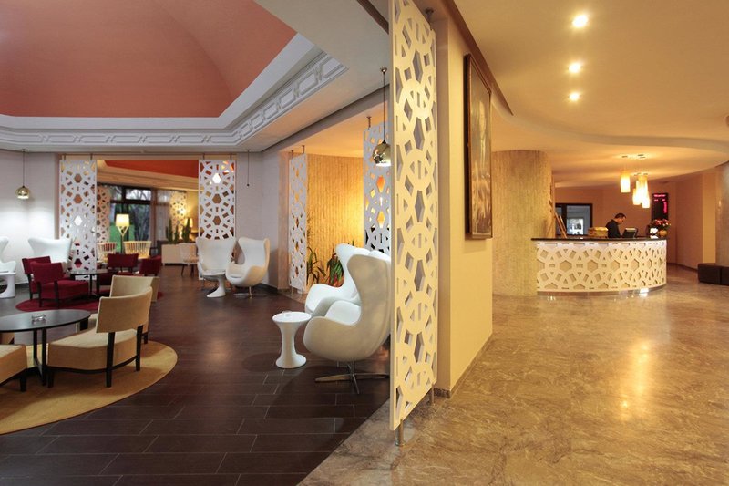 This spa hotel is situated on a main road in the heart of Agadir, not more than fifty yards from the sandy beach. The nearest public transportation options are approximately a quarter mile away. It is about 20 miles to Agadir (AGA) Airport.