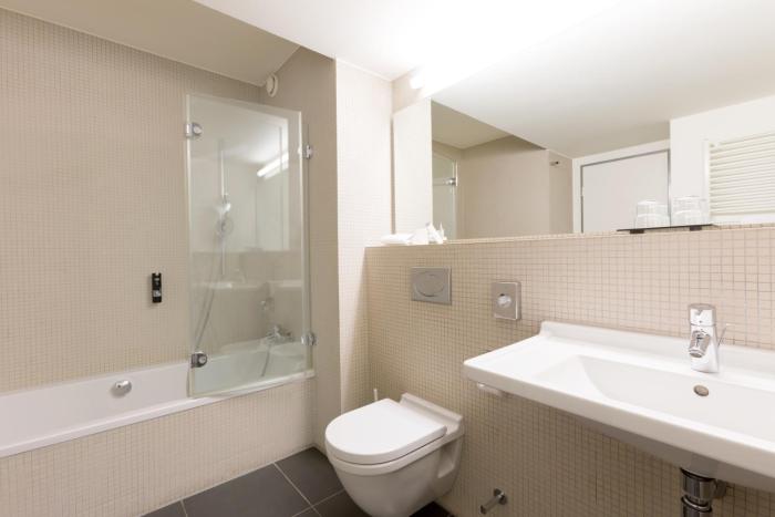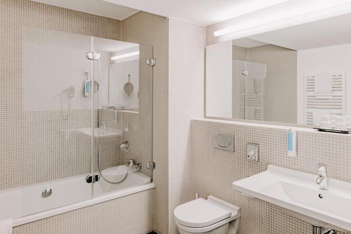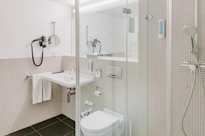 Air conditioning and individually adjustable heating ensure that rooms maintain comfortable temperatures. All rooms are carpeted and include a double bed. A safe, a minibar and a desk are also available. Guests will also find a tea/coffee station included among the standard features. An ironing set is provided for guests' convenience. A direct dial telephone, a television with satellite/cable channels, a radio, an alarm clock and WiFi are provided as well. A shower and a bathtub are included the bathrooms. A hairdryer, a vanity mirror and bathrobes are provided. As a special feature, bathrooms are also stocked with cosmetic products and a selection of towels. Wheelchair-friendly rooms can be booked. Family rooms are available for parents with children.